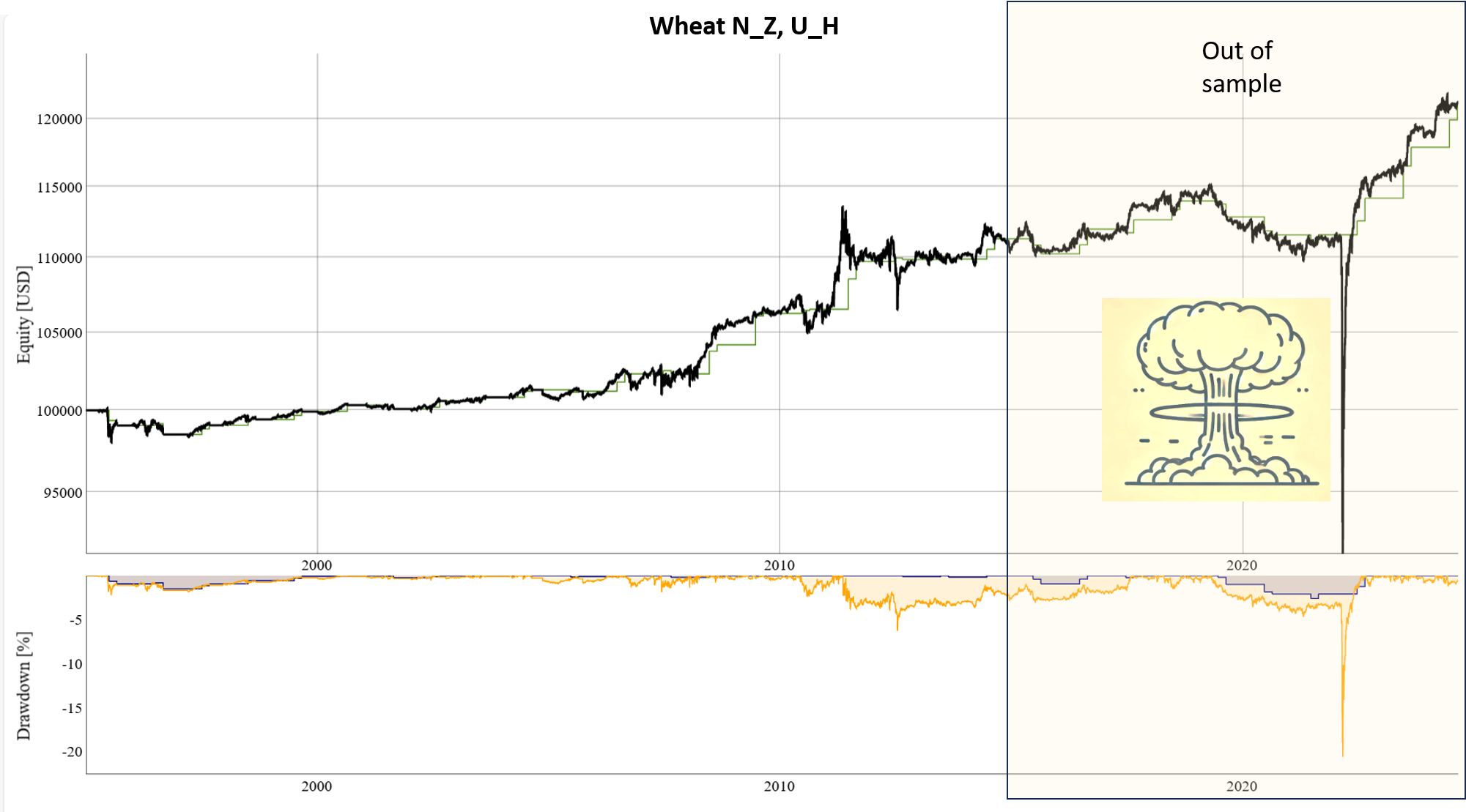 Trading a portfolio with many spreads at small size helps reduce the tail risk, like the wheat example shown.