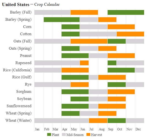 Let’s find an explanation for the observed behavior, based on literature and intuition. Here is the crop calendar for USA, which we can use to define the spreads for different agricultural commodities: