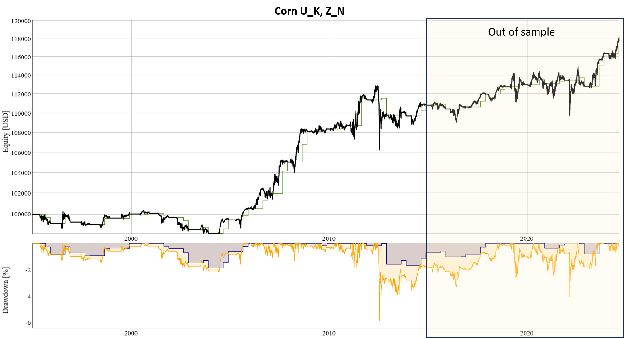 Searching the literature for common Corn spreads, we find that U_K is not such a commonly traded spread. But I believe it makes sense to trade it: it captures the price differences between the old crop and the new crop, due to storage costs, seasonal demand, and weather uncertainties. My theory: as we move forward towards expiration of the front contract, these uncertainties, which are prices in the spread, reduce, causing a part of the negative carry drift we observe.