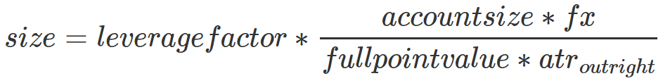 We can risk, for example, 1% of the account if the spread value moves 1 full ATR of the outright futures price. That would correspond to a leverage factor of 0.01 in the above formula.