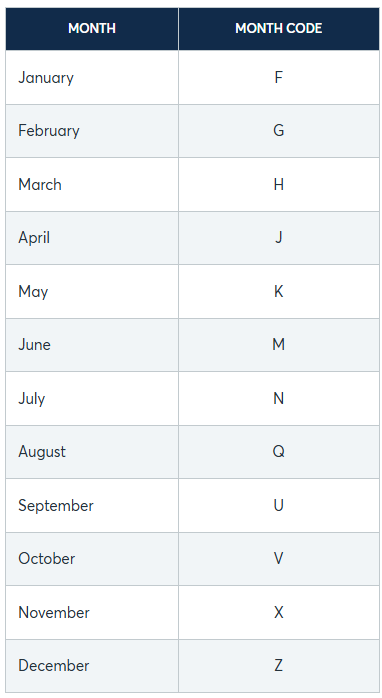 The month codes are listed here: CME contract month codes. Here is the table for easier reference: