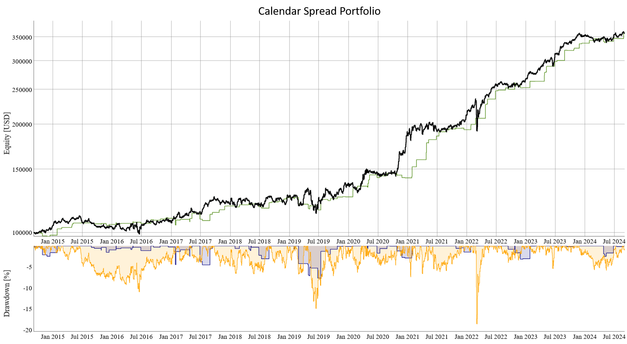Calendar spread strategies allow traders with smaller accounts to afford large contracts such as gasoline, corresponding to 42,000 gallons. We are going long and short different expiration contracts of the same market. There are hundreds of calendar spreads which can be accessed in the futures markets. When trading spreads you de-couple from the movement of the underlying market, hence building a portfolio of spreads would benefit diversification.