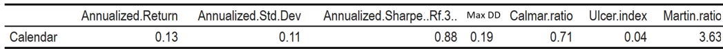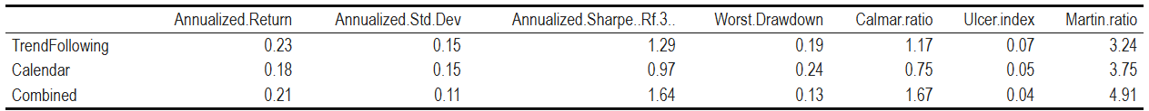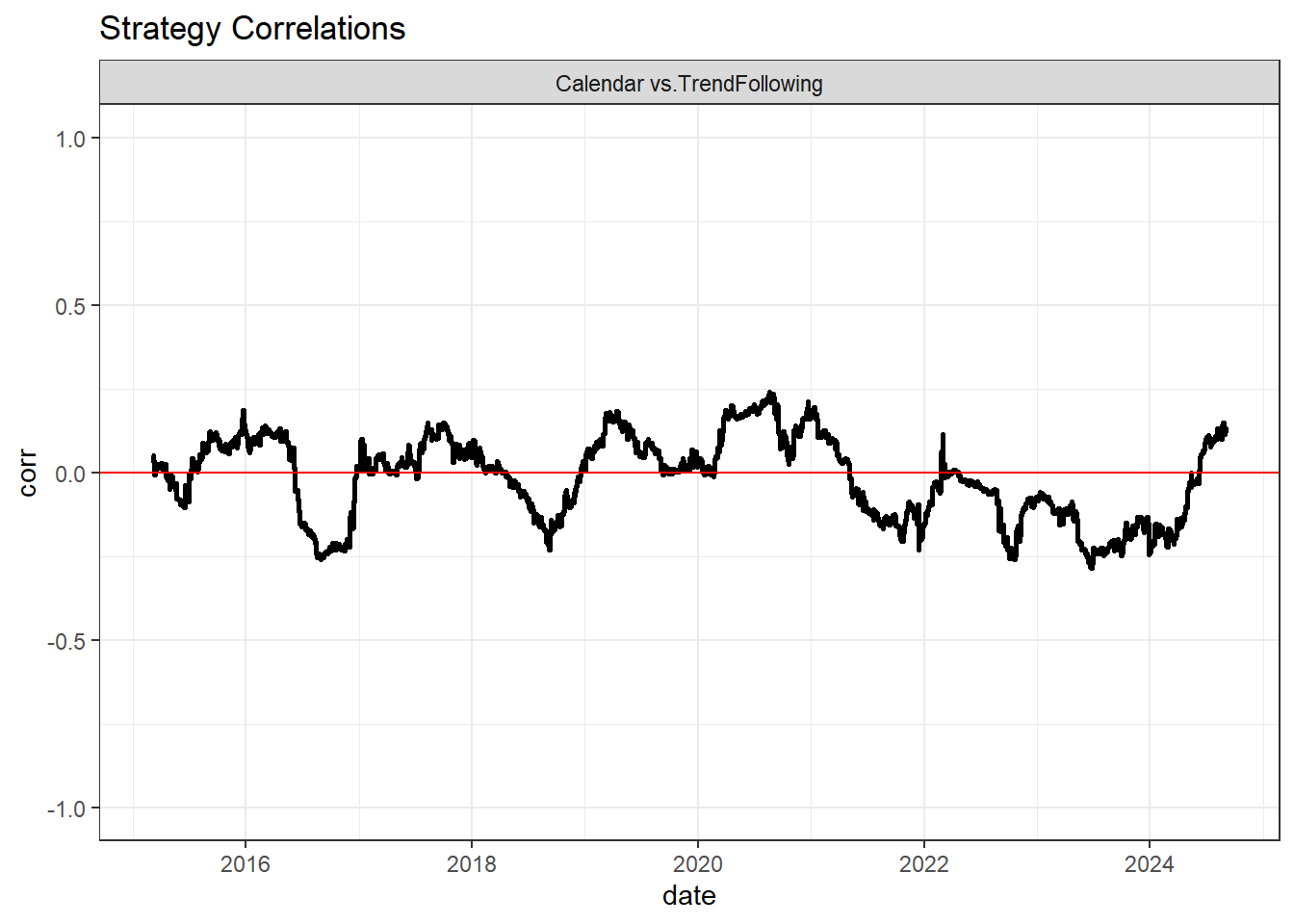 The calendar spread portfolio performance should be uncorrelated to a trend following strategy. Let’s check: