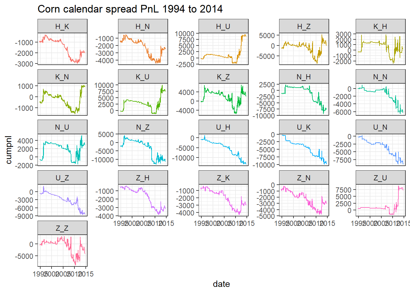 This is a matrix of the PnL of holding different corn spreads from 1994 to 2014, where volume is acceptable (>1000 contracts) on both legs. Let’s reserve the last 10 years for validation.