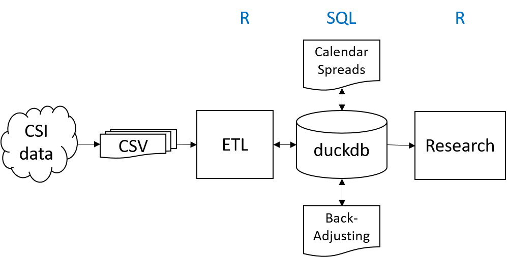 The data arrives from CSI Data (my futures data provider) in 1 CSV file for each individual futures contract (>10K historical contracts in total). An ETL code in R reads the CSVs, does some quality checks, and writes the data into the duckdb database. Thereafter we run 2 SQL scripts in duckdb. One to process the individual futures contracts into back-adjusted time series (one time series for each market), and the other one to compute all calendar spreads, from contiguous contracts to contracts 1 year apart, within the same market. This is how it looks more or less: