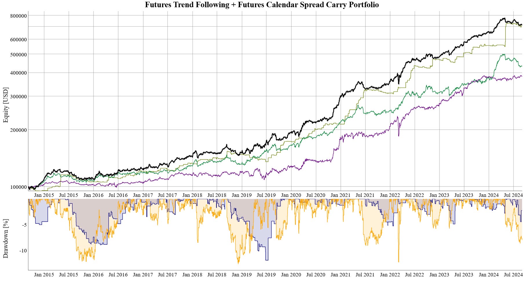 Rolling correlations are around 0. This strategy should be a powerful diversifier. Let’s make a “Naive” 1/N allocation to both Trend Following and Calendar Spreads portfolio (50/50, with both strategies scaled to 15% annualized volatility). This is how it looks: